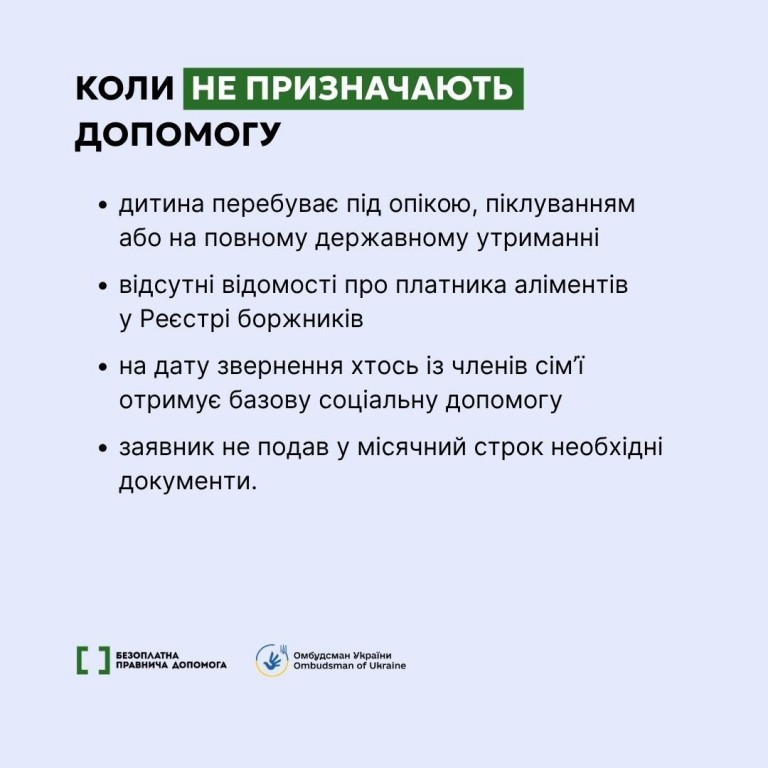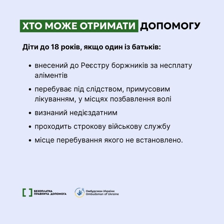 Як зазначають фахівці Безоплатної правничої допомоги (БПД), якщо один із батьків не сплачує аліменти - держава надає тимчасову допомогу дітям. Зокрема її призначають, якщо один із батьків ухиляється від сплати або місце його проживання невідоме.