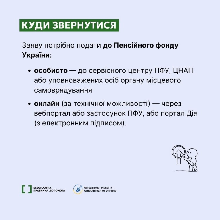 - Пенсійного фонду України - за номером 0 800 503 753 або електронною поштою info@pfu.gov.ua.