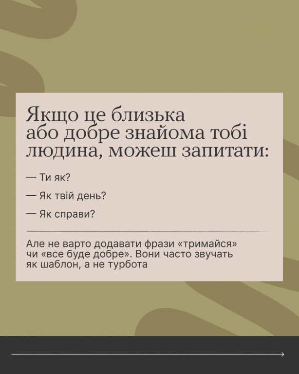 А в голові зберігай правило: не такі важливі ідеальні слова, як людяність - спокій, щирість, повага. У них завжди найкращі прояви підтримки.