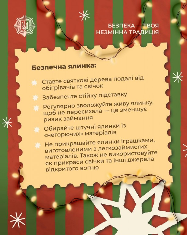 Фахівці ДСНС України зібрали на інфографіці найважливіші поради, які допоможуть створити святкову атмосферу без зайвих хвилювань: як вибрати безпечну електрогірлянду, куди краще ставити ялинку, як закріплювати прикраси та на що звертати увагу.