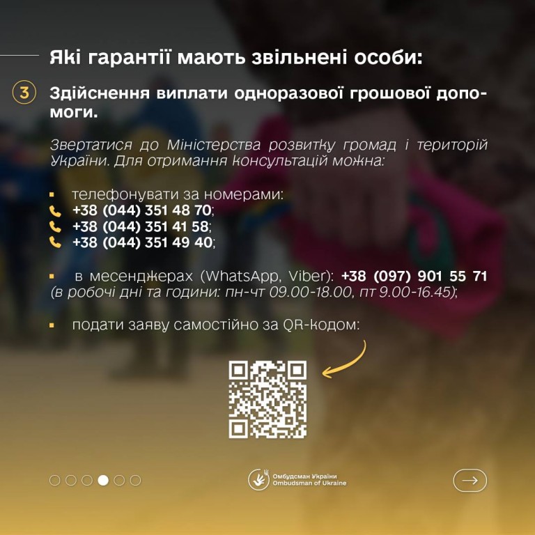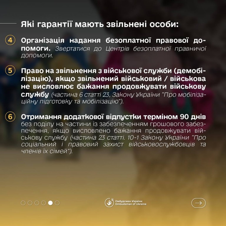 Як зазначає Омбудсман України, ця категорія військовослужбовців має право на різноманітні соціальні гарантії, які включають медичну допомогу, правову підтримку, фінансову допомогу, а також допомогу у відновленні документів та адаптації до мирного життя.