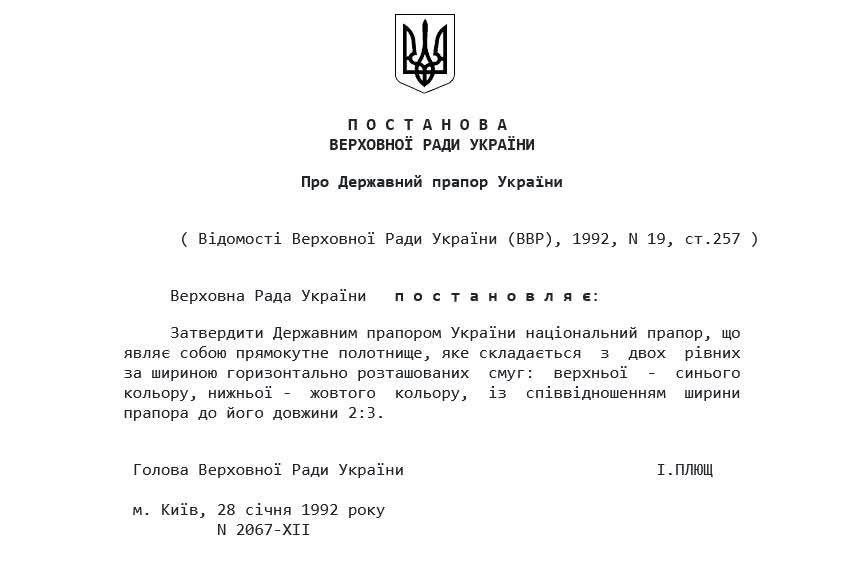 "Затвердити Державним прапором України національний прапор, що являє собою прямокутне полотнище, яке складається з двох рівних за шириною горизонтально розташованих смуг: верхньої - синього кольору, нижньої - жовтого кольору, із співвідношенням ширини прапора до його довжини 2:3." (Постанова Верховної Ради України № 2067-XII від 28 січня 1992 року Про Державний прапор України (Відомості Верховної Ради України (ВВР), 1992, N 19, ст.257).