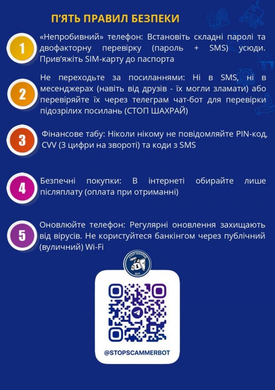 - нікому не повідомляйте PIN-коди, CVV, паролі та коди з SMS;