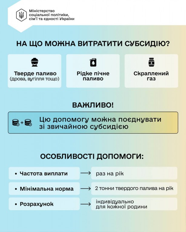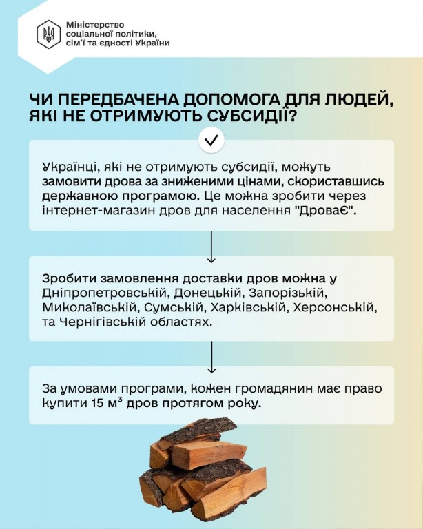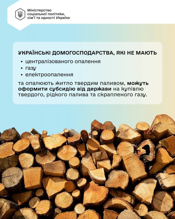 Держава передбачила окрему підтримку для домогосподарств без централізованого опалення, газу чи електроопалення — субсидію на придбання дров, вугілля, рідкого пічного палива та скрапленого газу.
