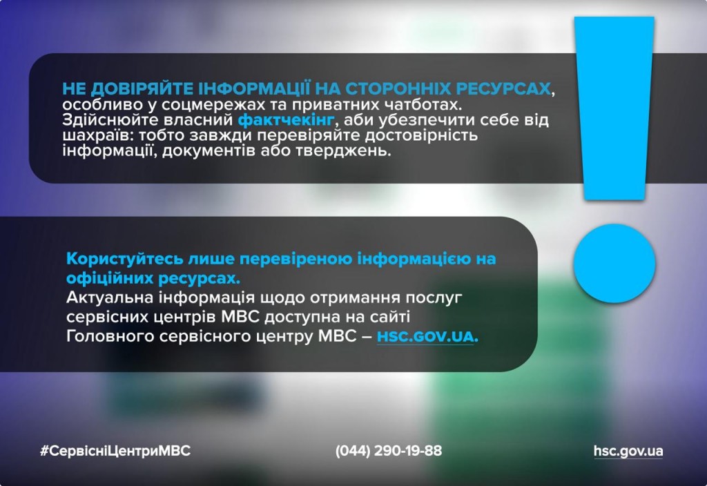 - Користуйтесь лише перевіреною інформацією на офіційних ресурсах. Актуальна інформація щодо отримання послуг сервісних центрів МВС доступна на сайті Головного сервісного центру МВС.