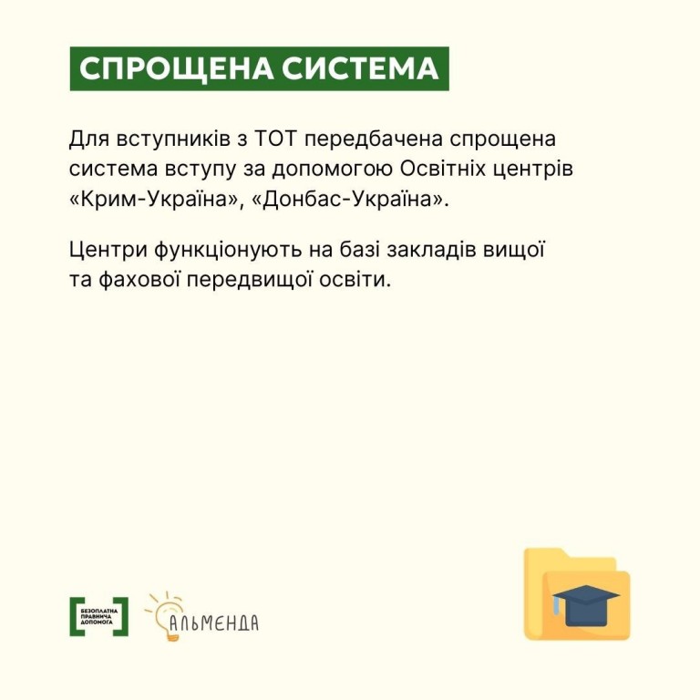 Як зазначають фахівці Системи надання безоплатної правничої допомоги, для випускників з тимчасово окупованих територій (ТОТ) передбачені спрощені умови вступу до закладів вищої освіти. Зокрема такі абітурієнти можуть вступати без НМТ та претендувати на окремі бюджетні місця.