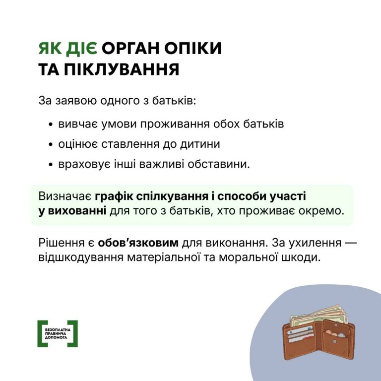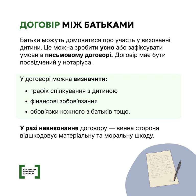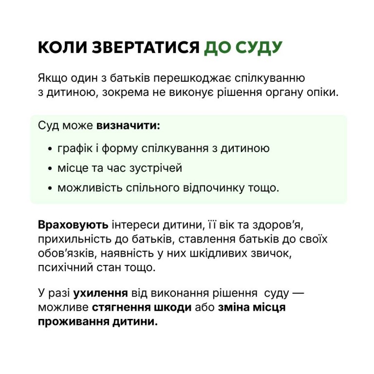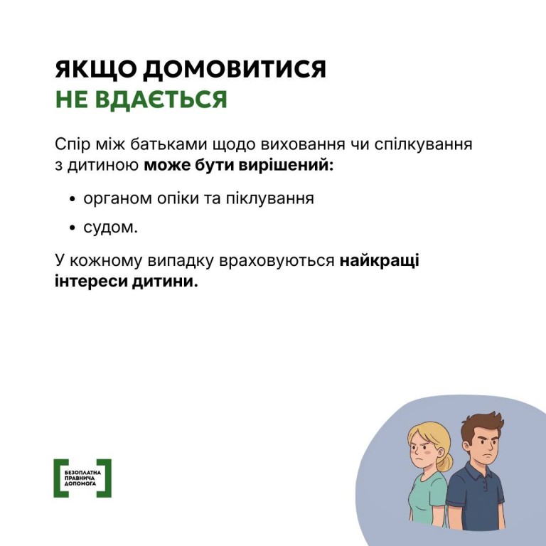 Як зазначають фахівці Системи надання безоплатної правничої допомоги (БПД), той із батьків, хто живе окремо, має право брати участь у вихованні та спілкуватися з дитиною, а інший не має права цьому перешкоджати, якщо це не шкодить дитині.