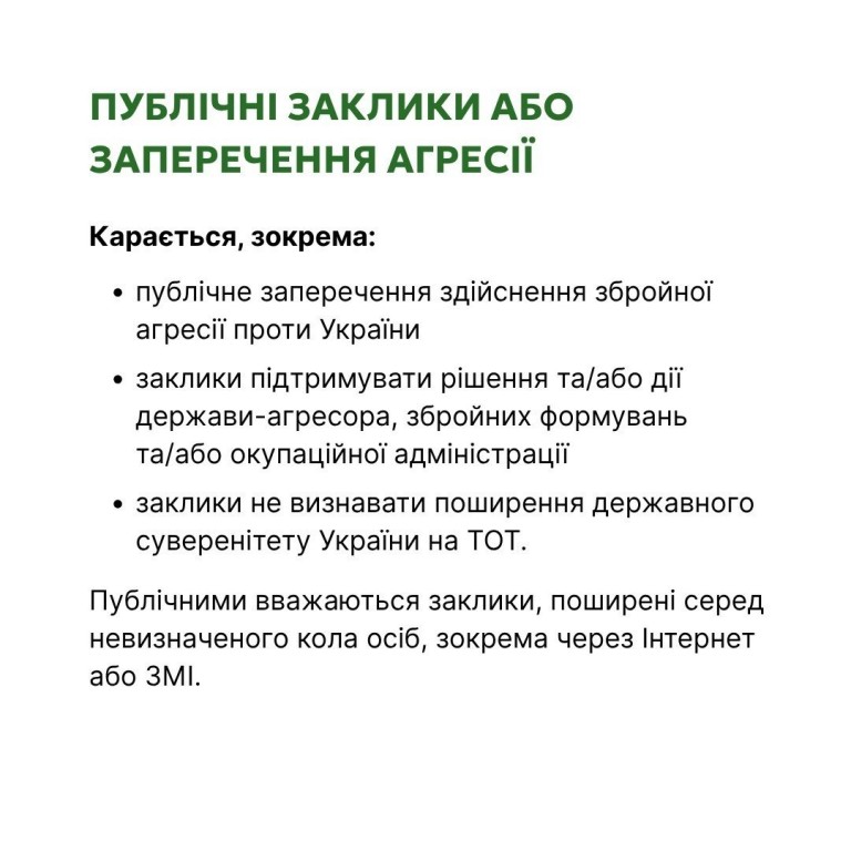 Які дії можуть вважатися співпрацею з державою-агресором та яке покарання застосовується - в картках.
