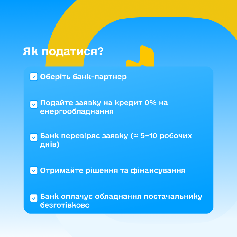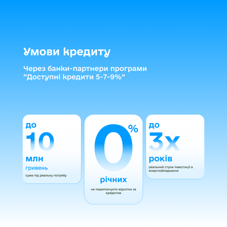 - Кредит можна отримати на строк до 3 років в розмірі до 10 млн грн для придбання та підключення енергообладнання.